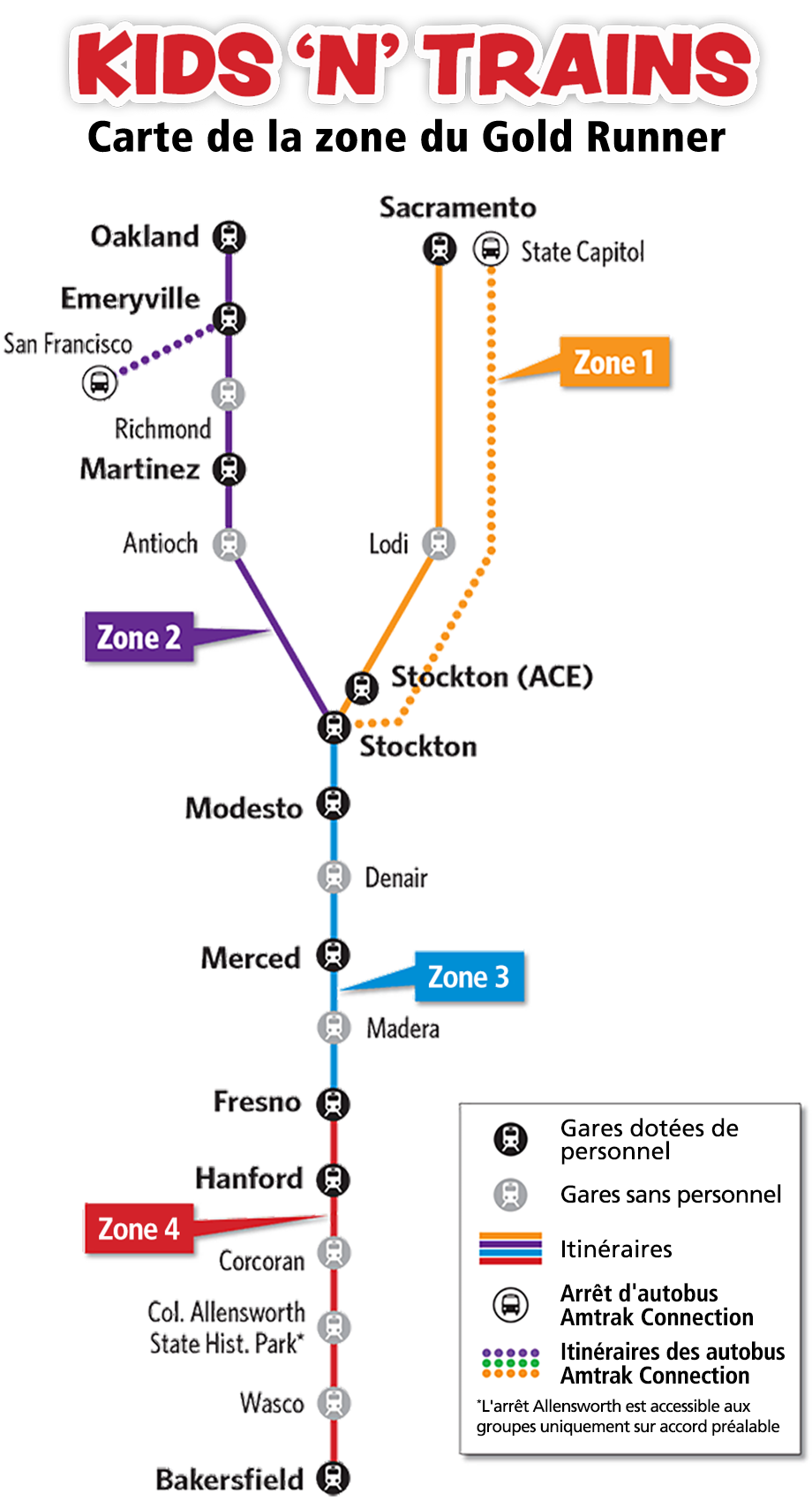 Zone 1 : de Sacramento à Stockton (les voyages en bus de correspondance Amtrak sans segment ferroviaire dans l’itinéraire ne sont pas autorisés)